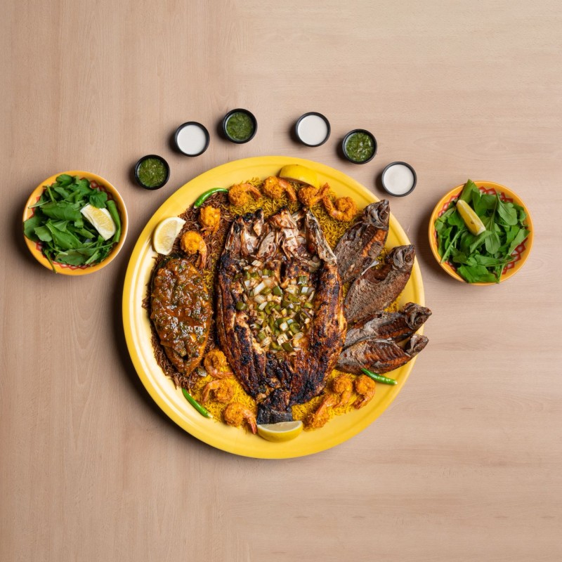 سبريم مشوي بالفرن ، صافي مقلي بسكوت ، كنعد مطبوخ ، ربيان مجبوس ، رز مشكل ، سلطة جرجير ، معبوج وطحينه .