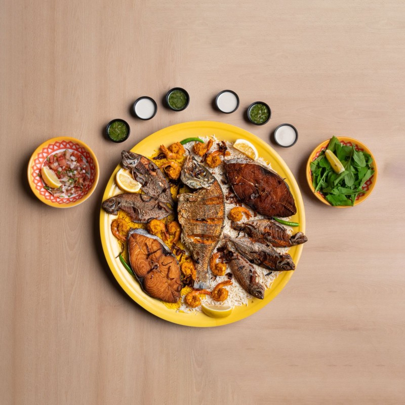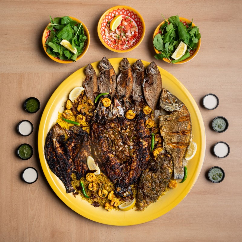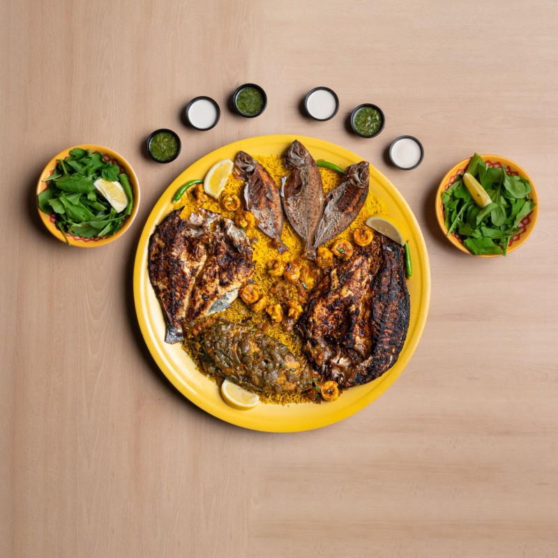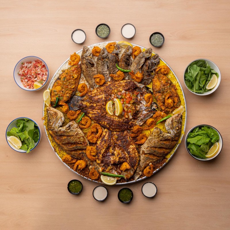 عروسة مشوية بالفرن ، صافي مقلي بسكوت، سبريم مشوية بالفرن ، شعري مقلي ، كنعد مطبوخ ، ربيان مطبوخ ، رز مشكل ، سلطة جرجير وطماطم وبصل ، طحينة ومعبوج